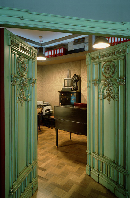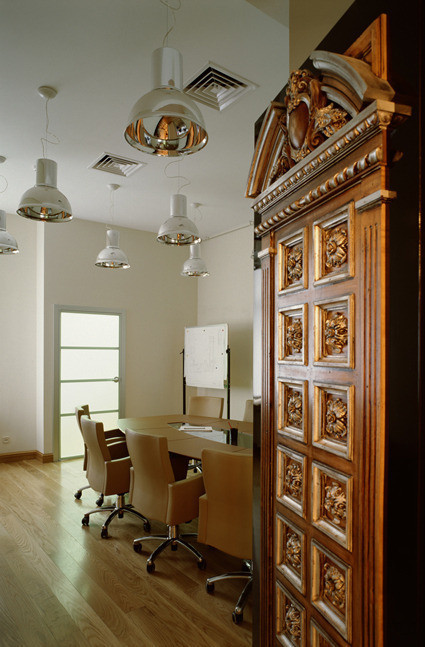 The design of the office is dictated by the architecture of the premises, located on two floors of a centenary building in Trubnikovsky Lane on Arbat. Since the company is focused on a “modernized empire” in the implementation of projects, which implies the use of expensive natural materials and author's design, the office is also partly a showroom where author's furniture, paintings, paintings, fabrics and everything that creates a view of a potential customer are presented about the work of designers and architects of the company.Total area - 213 sq.mPainting, stucco, light - Targetti, Tezzani, Furniture - Angello Cappellini, Tonon, Driade, MorosoThe project is 5 months, construction and finishing work is 9 months.2006 year
