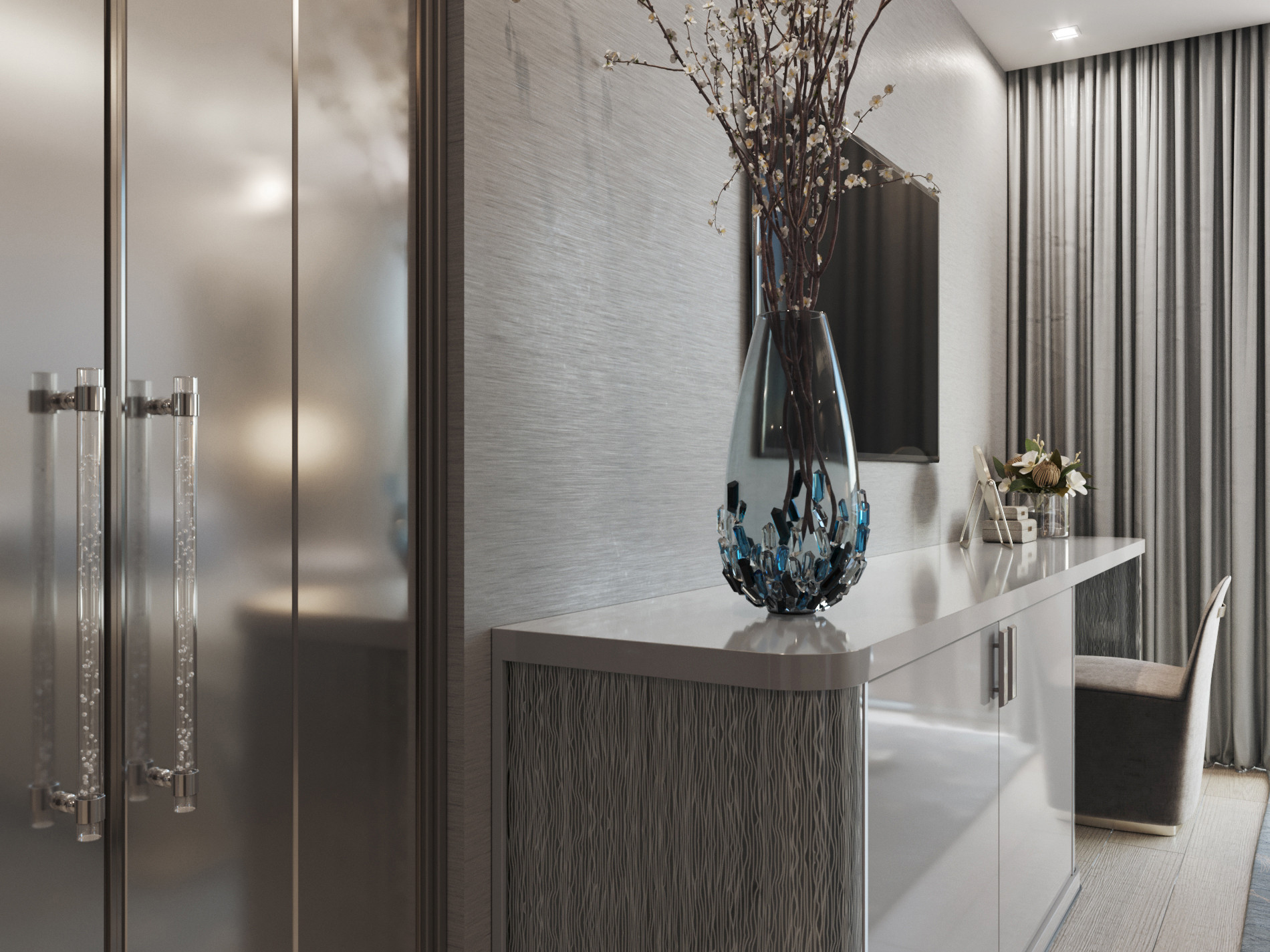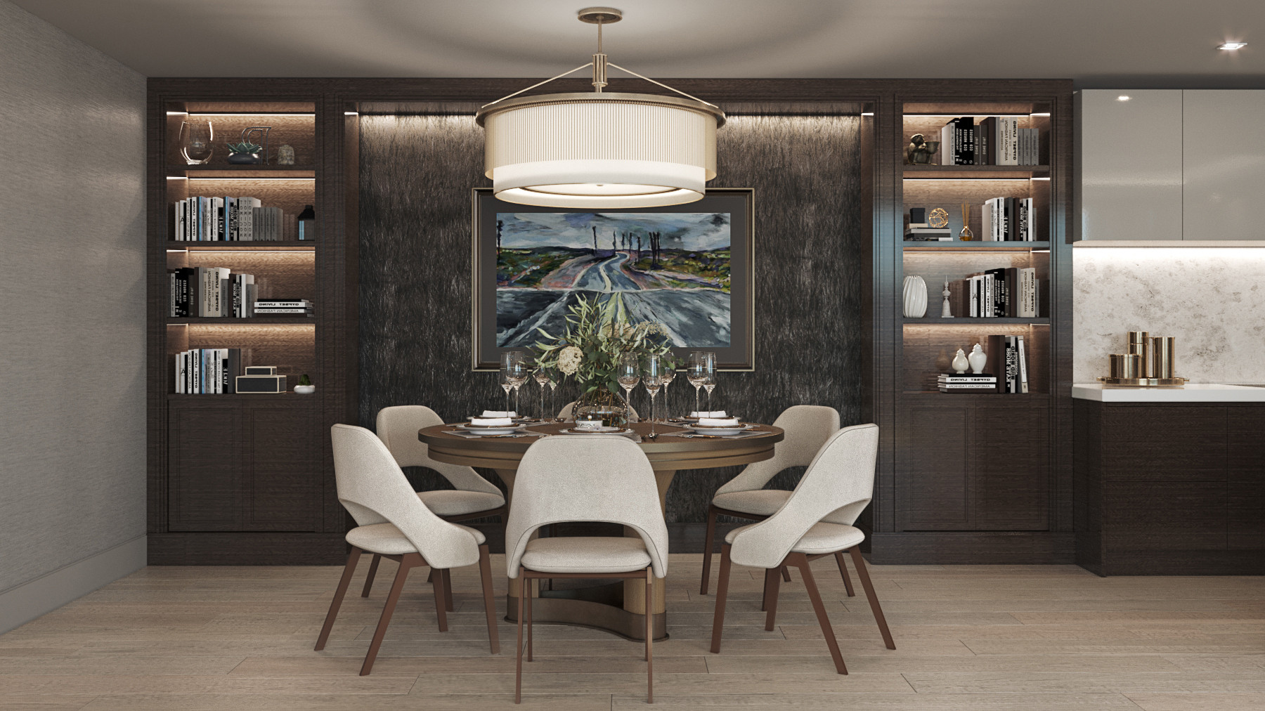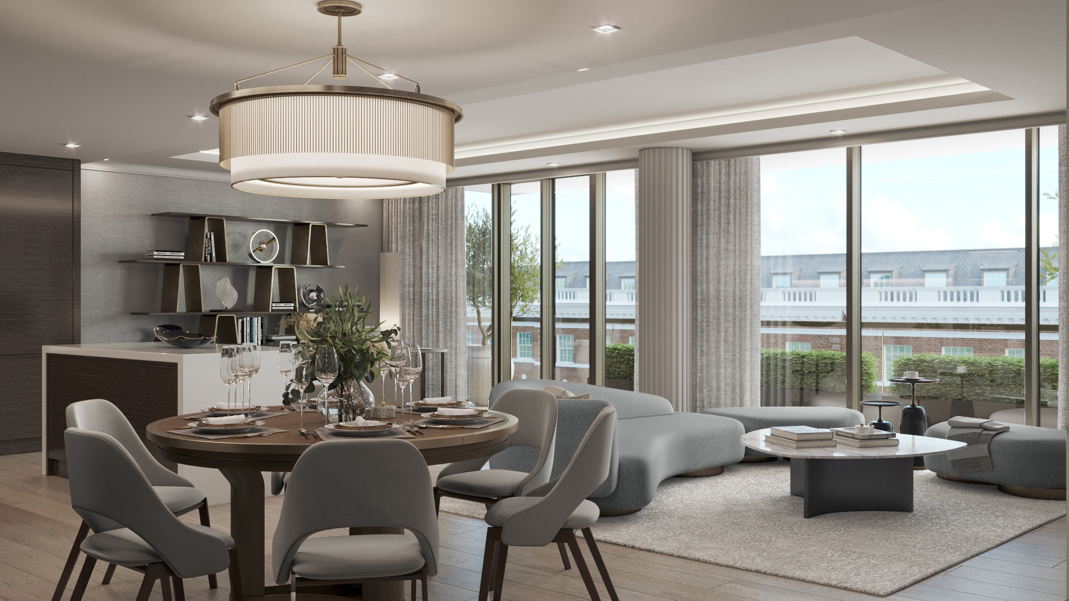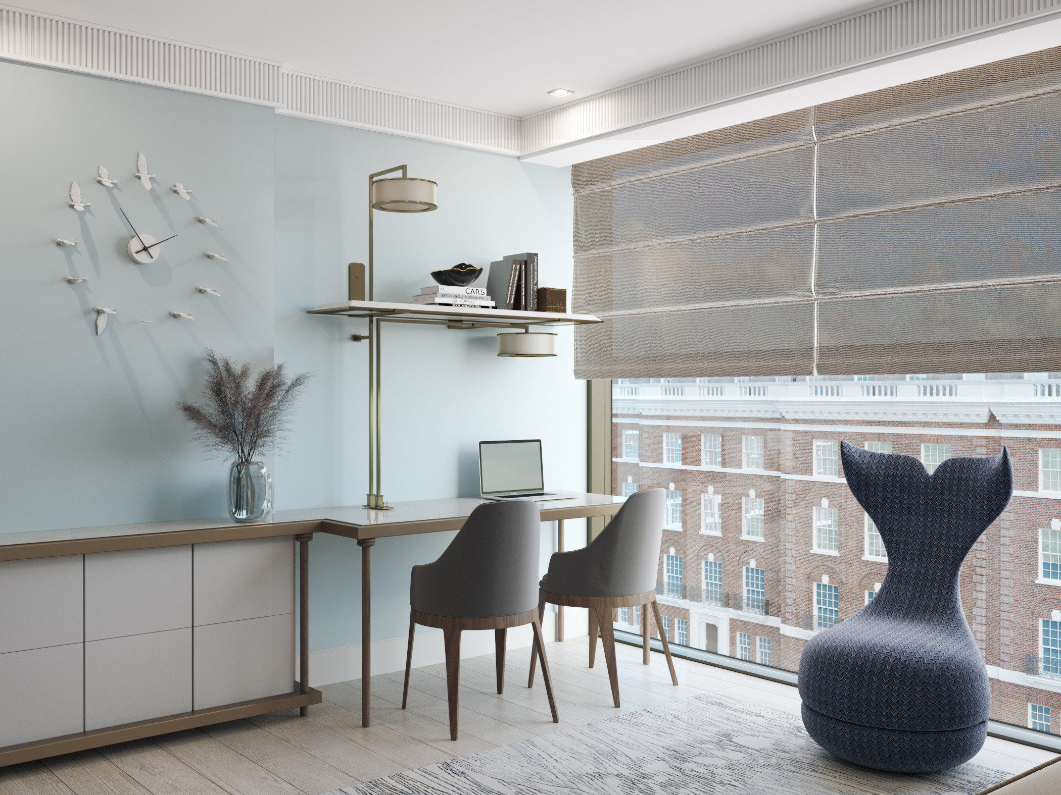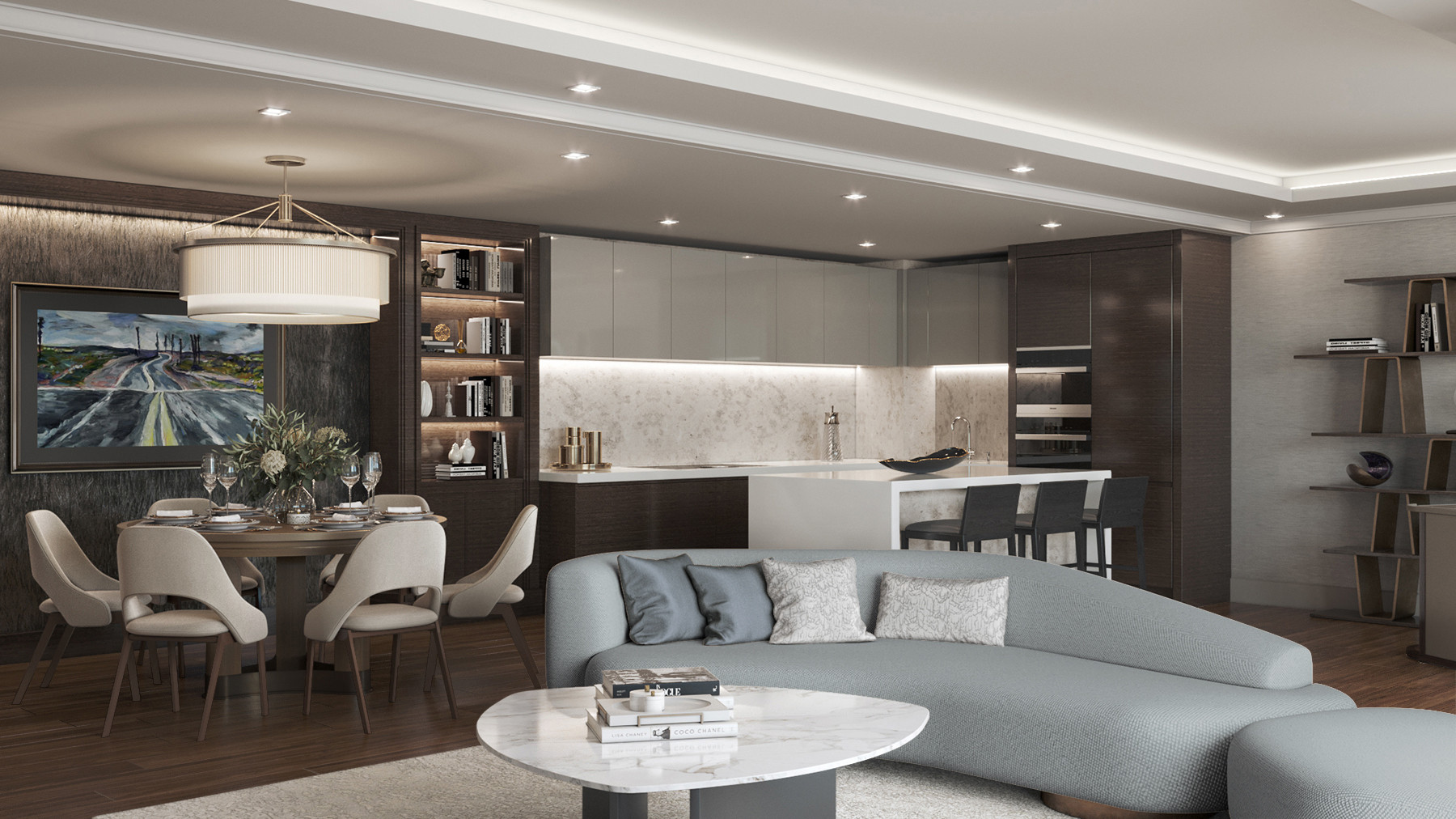 This young family commissioned us to create a modern and elegant interior in a historical building. The open plan apartment has beautiful panoramic windows that fills the space with daylight, allowing us to experiment with colours. For the kitchen and the dining area, we used dark shades of wood and wallcoverings, whereas in the sitting zone we made accents on light colours and soft forms and textures.